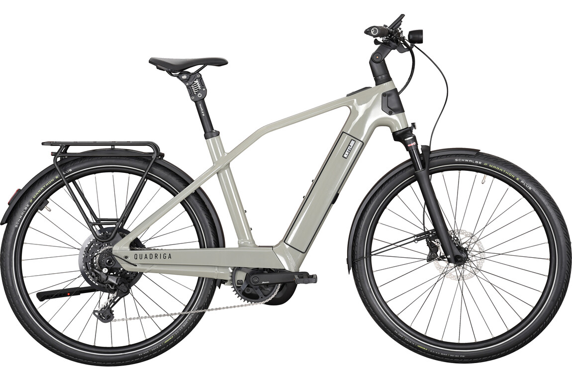 Das neue QUADRIGA CX10 bietet eine beeindruckende Kombination aus innovativer Technik und hochwertigen Anbauteilen. Der neue Performance Line CX Motor sorgt mit optimierter Sensorik und weiter reduzierter Geräuschbildung für ein besonders harmonisches Fahrgefühl, während die verbesserte Rahmengeometrie und der Aluminium-Kettenkasten für Komfort und Langlebigkeit stehen. Mit der optionalen Frontkorb-Montage und dem beleuchteten Logo setzt das QUADRIGA CX10 Maßstäbe in Sachen Design und Funktionalität. Der tiefe und breite Einstieg erleichtert das Auf- und Absteigen beim täglichen Stop-and-go in der Stadt. Die besonders große Bildschirmfläche des Bosch Kiox 500 Displays zeigt wichtige Informationen wie Akkustand, Reichweite oder Geschwindigkeit klar an. Die größeren Schaltflächen verbessern die Bedienung erheblich. Gerade auf unebenen Straßen oder Schotterwegen sorgen die Suntour-Luftfedergabel und die Parallelogrammfederstütze von by.schulz für hohen Fahrkomfort. Für mehr Stabilität beim Abstellen des E-Bikes kann ein Zweibeinständer montiert werden. Das Be-und Entladen des Bikes wird dadurch einfacher und sicherer. Die im Rahmen integrierte Aufnahme für ein nachrüstbares GPS-Modul verbessert per Tracking den Diebstahlschutz. Das QUADRIGA CX10 ist die sichere und komfortable Wahl für den täglichen Einsatz.