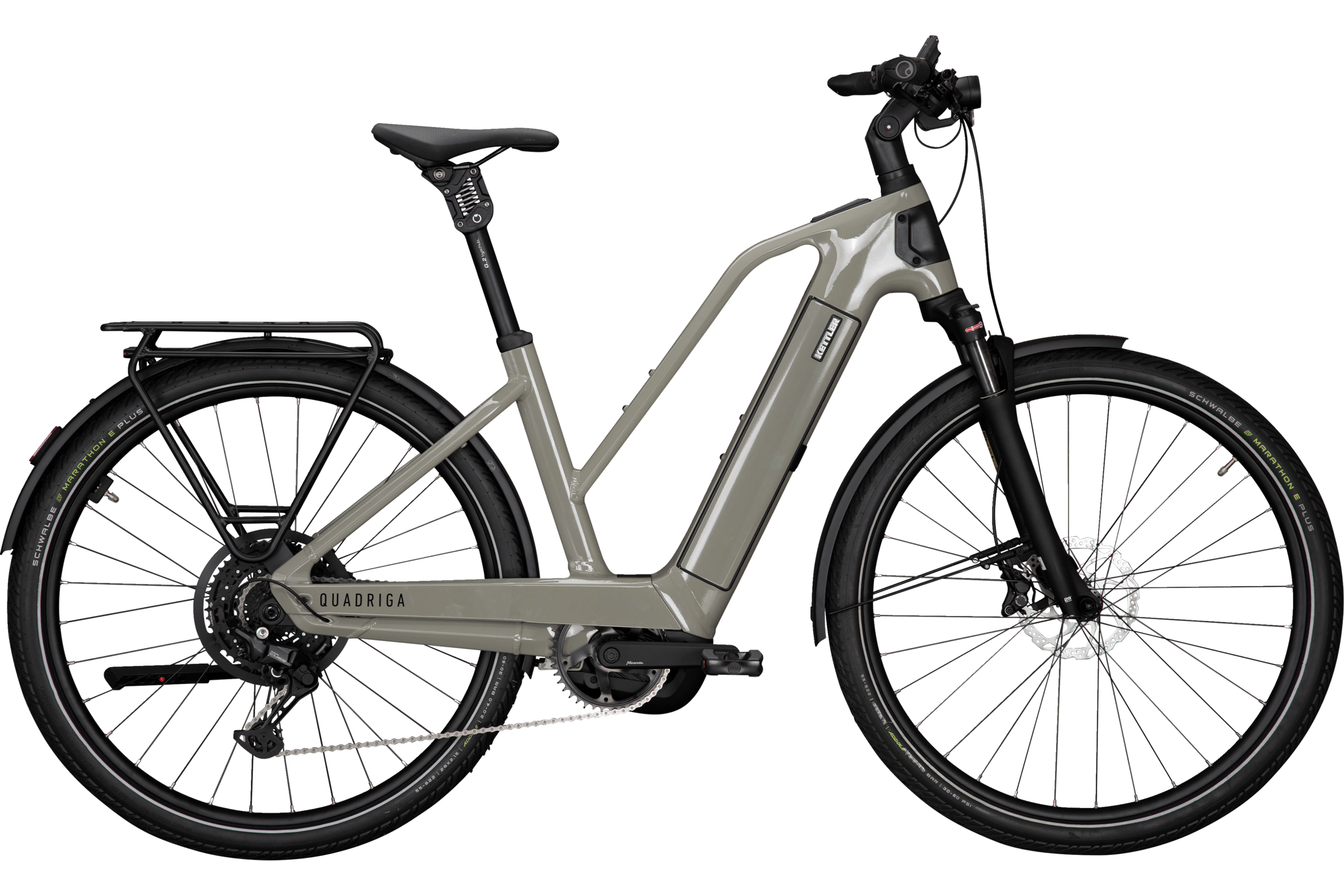 Das neue QUADRIGA CX10 bietet eine beeindruckende Kombination aus innovativer Technik und hochwertigen Anbauteilen. Der neue Performance Line CX Motor sorgt mit optimierter Sensorik und weiter reduzierter Geräuschbildung für ein besonders harmonisches Fahrgefühl, während die verbesserte Rahmengeometrie und der Aluminium-Kettenkasten für Komfort und Langlebigkeit stehen. Mit der optionalen Frontkorb-Montage und dem beleuchteten Logo setzt das QUADRIGA CX10 Maßstäbe in Sachen Design und Funktionalität. Der tiefe und breite Einstieg erleichtert das Auf- und Absteigen beim täglichen Stop-and-go in der Stadt. Die besonders große Bildschirmfläche des Bosch Kiox 500 Displays zeigt wichtige Informationen wie Akkustand, Reichweite oder Geschwindigkeit klar an. Die größeren Schaltflächen verbessern die Bedienung erheblich. Gerade auf unebenen Straßen oder Schotterwegen sorgen die Suntour-Luftfedergabel und die Parallelogrammfederstütze von by.schulz für hohen Fahrkomfort. Für mehr Stabilität beim Abstellen des E-Bikes kann ein Zweibeinständer montiert werden. Das Be-und Entladen des Bikes wird dadurch einfacher und sicherer. Die im Rahmen integrierte Aufnahme für ein nachrüstbares GPS-Modul verbessert per Tracking den Diebstahlschutz. Das QUADRIGA CX10 ist die sichere und komfortable Wahl für den täglichen Einsatz.